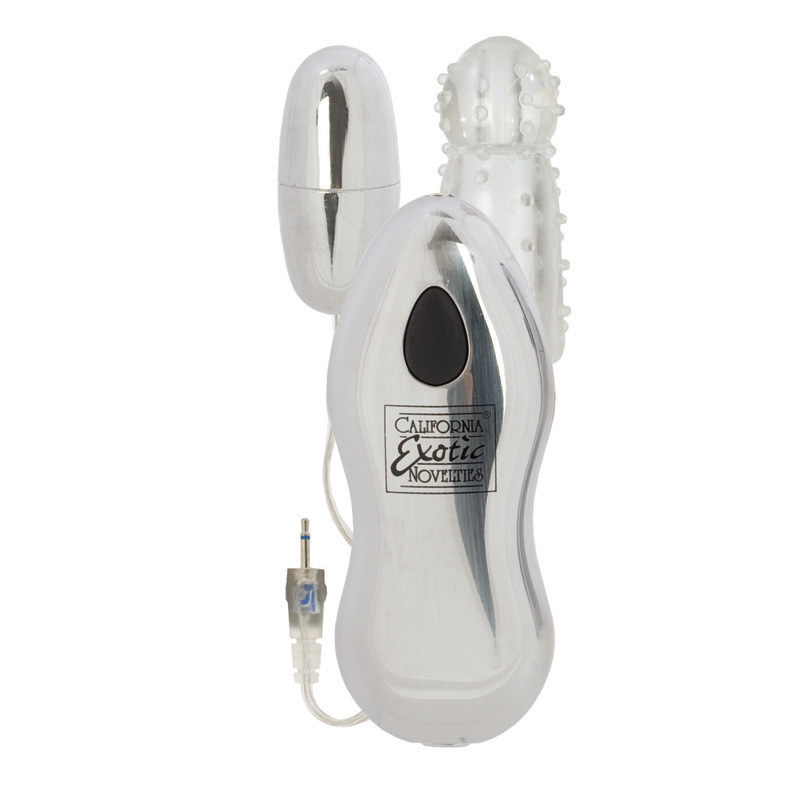 Sterling Collection Combo 3 powerful 2 speed push button controller with single plug-in jack. Soft and stretchy bullet sleeve with pleasure bumps. Standard silver bullet is made using phthalate free, non-toxic materials ABS plastic with silver plating bullet and controller, Thermoplastic Rubber TPR sleeve. Vibrating sex toy requires 2 AA batteries, not included. Do not leave batteries in the vibrator between uses. Controller measures 4.5 inches long by 1.75 inches wide, bullet vibrator measures 2.2 inches long by 1 inch wide. Bulk weight: 2.8 ounces. Always clean before and after use. Category: For Women, Bullets, Beads & Balls, Bullets. Sterling Collection Combo 3 is a registered trademark for California Exotic Novelties. Sex toys and sexual wellness. New high resolution images added.