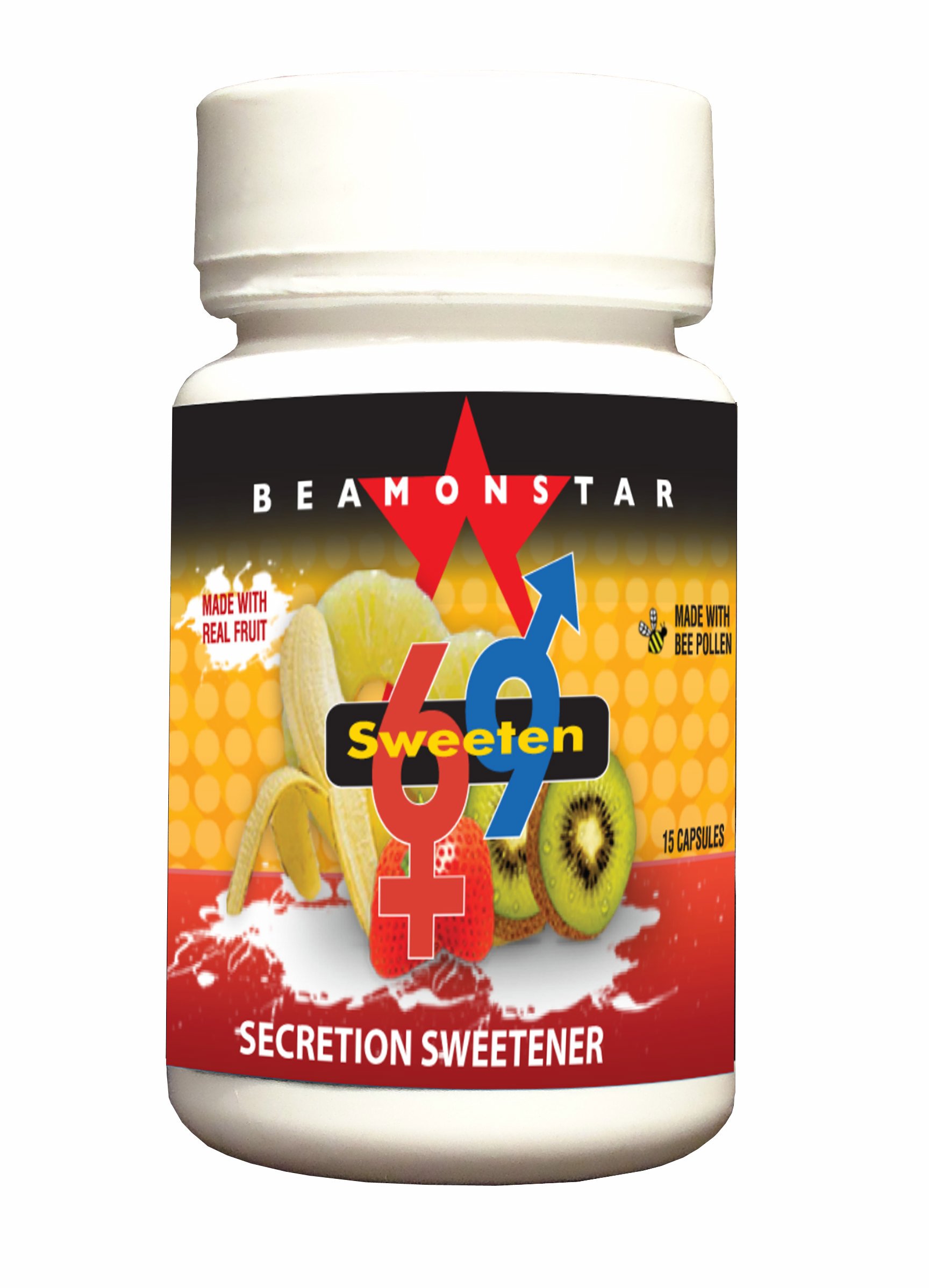 Sweeten 69 15 pieces bottle makes for better tasting oral foreplay for him and hers. Best when shared with a friend. Sweetener is not just for coffee and tea. Sweeten 69 uses ingredients like pineapple, bee pollen and royal jelly to sweeten the taste of male ejaculation and female secretions. Share these chewable tablets with a friend and sex will taste so sweet. Better tasting oral foreplay for him and hers. Best when shared with a friend. Sweetener is not just for coffee and tea. Features: secretion sweetener. Last longer during foreplay. Your bodily fluids will taste a bit more tasty and will help eliminate unwanted odors. People who take Sweeten 69 report more satisfying oral sex. These statements have not been evaluated by the Food and Drug Administration. This product is not intended to diagnose, treat, cure or prevent any disease. Oral sex enhancement. Beamonstar Products Inc. San Francisco, California 94111.